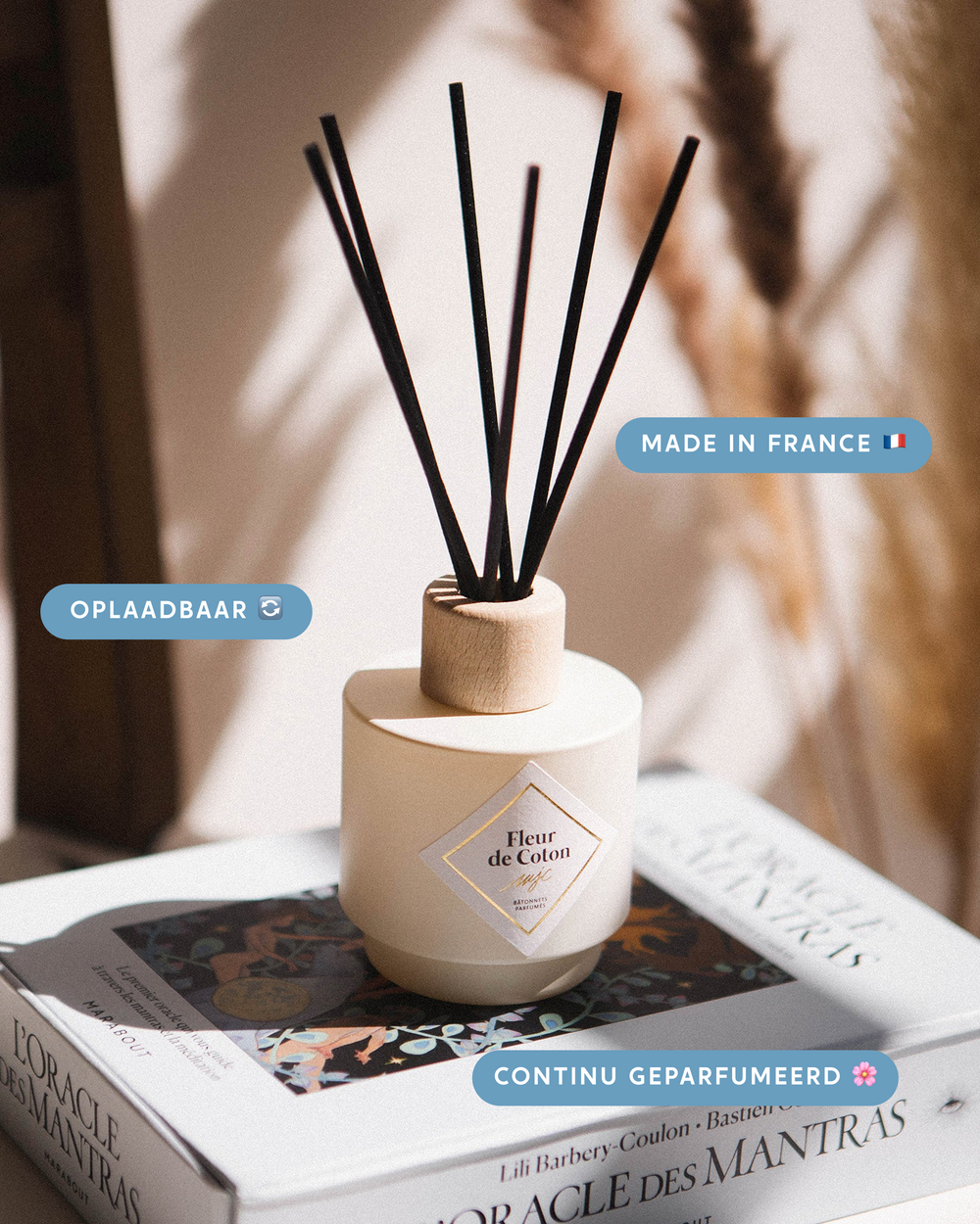 Voor een lichtere geur kunt u enkele stokjes verwijderen. Vul uw mooie flesje opnieuw met onze parfumnavullingen.