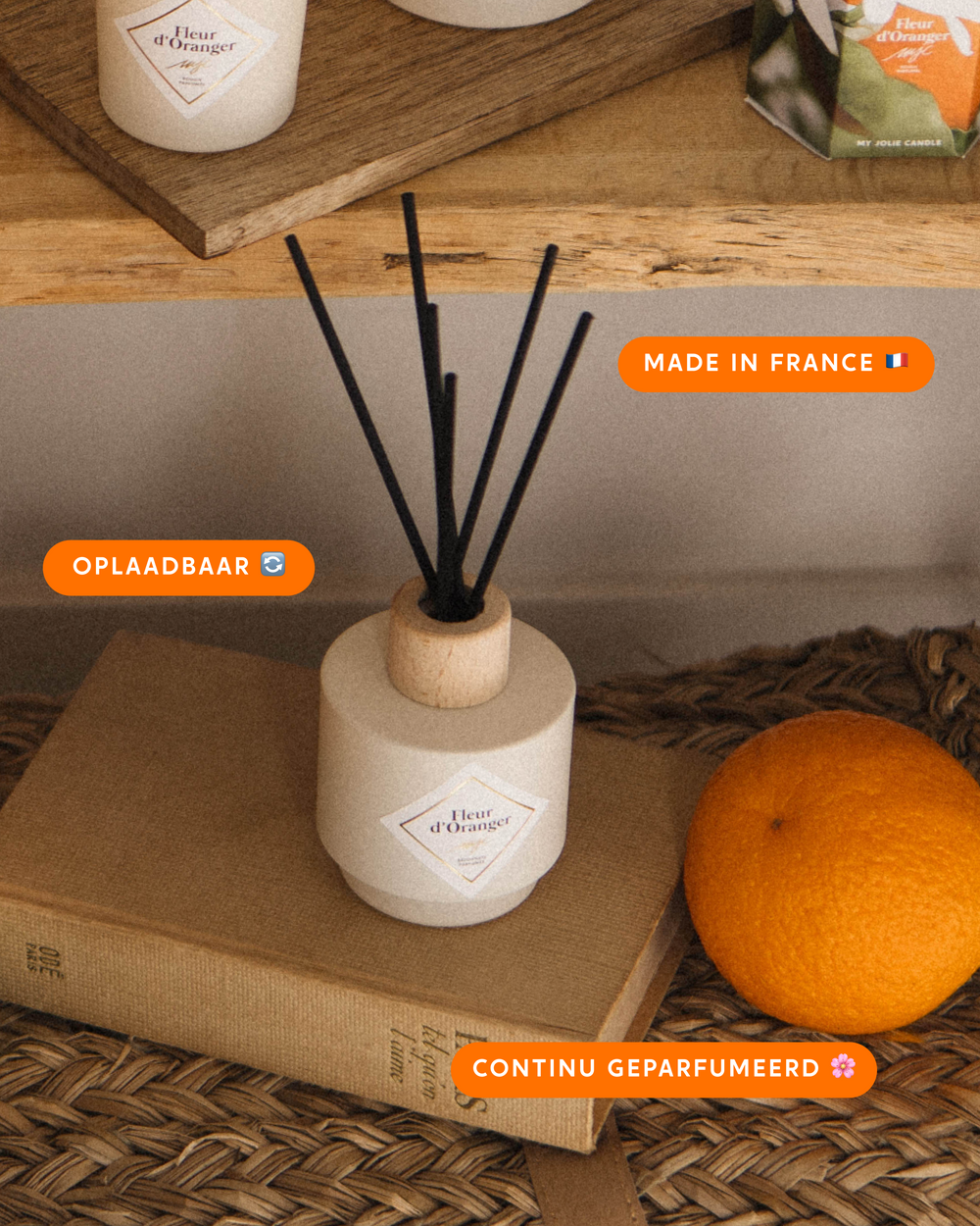 - Bevat: 100 ml parfum + herbruikbare pot + 8 stokjes