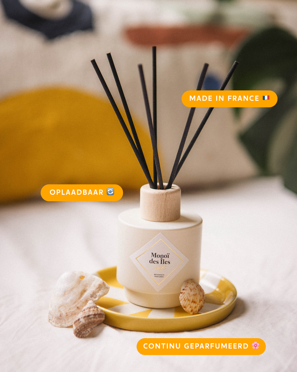 Voor een lichtere geur kunt u enkele stokjes verwijderen. Vul uw mooie flesje opnieuw met onze parfumnavullingen.