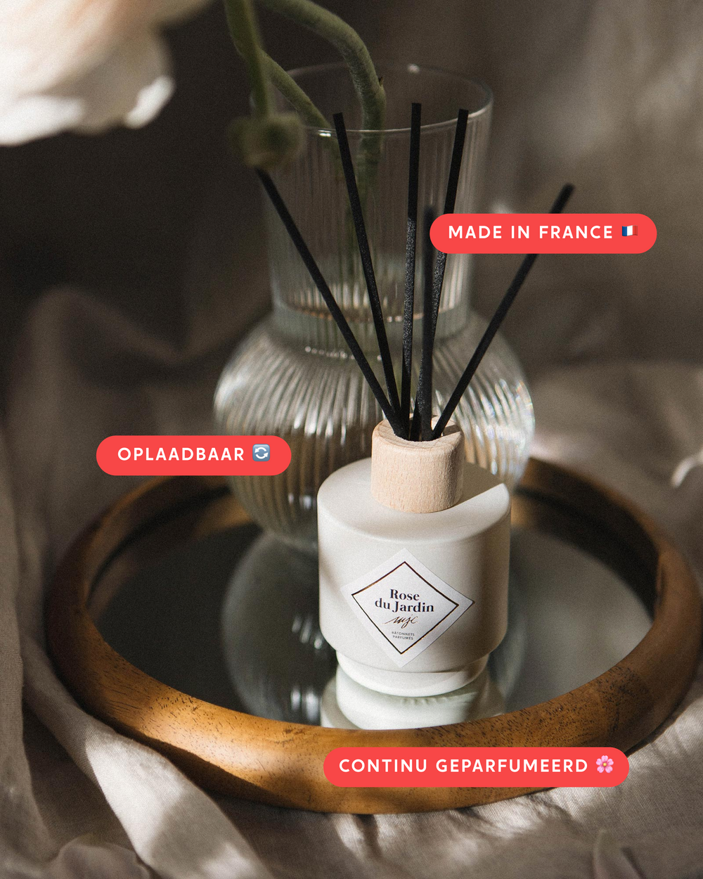 - Bevat: 100 ml parfum + herbruikbare pot + 8 stokjes