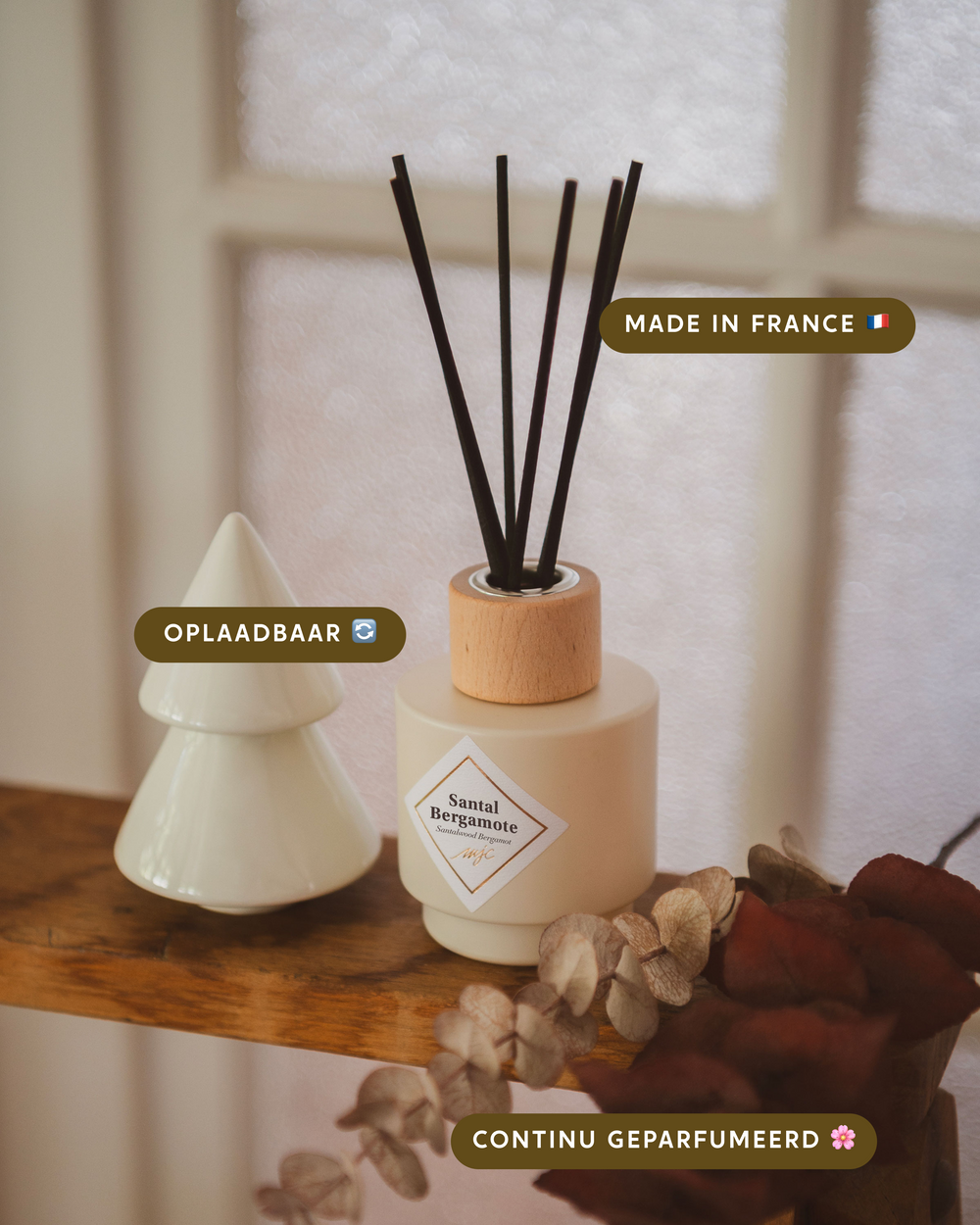 - Bevat: 100 ml parfum + herbruikbare pot + 8 stokjes