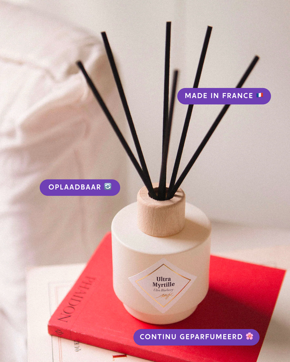 Voor een lichtere geur kunt u enkele stokjes verwijderen. Vul uw mooie flesje opnieuw met onze parfumnavullingen.