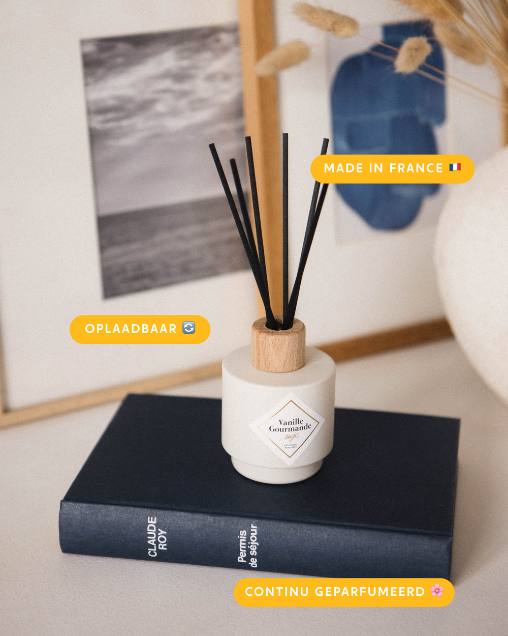 Verfris uw interieur gedurende meer dan vier weken dankzij een verspreiding door capillariteit. Vanille op zijn troostendst. Zachte, verslavende noten, licht zoet maar altijd elegant. Gebruik vervolgens uw mooie flesje opnieuw dankzij onze voordelige parfumnavullingen. Dit product is oplaadbaar.