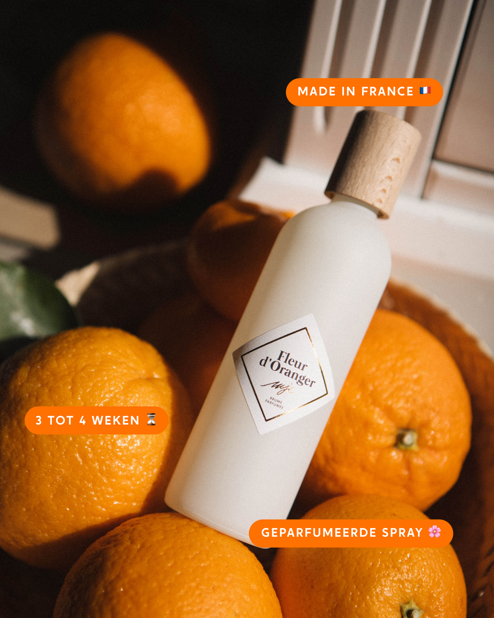 Met één enkele beweging verspreidt onze geparfumeerde spray Fleur d'Oranger onmiddellijk een langdurige geur. Marrakech, wanneer de dag op haar einde loopt... De lucht is nog warm, doordrenkt met zachte en verleidelijke noten. Je bevindt je in de schaduw van oranjebomen, waar de geur van bloemen naar de zon en de Middellandse Zee ruikt. Geniet tot wel 4 weken lang van een heerlijke geur.