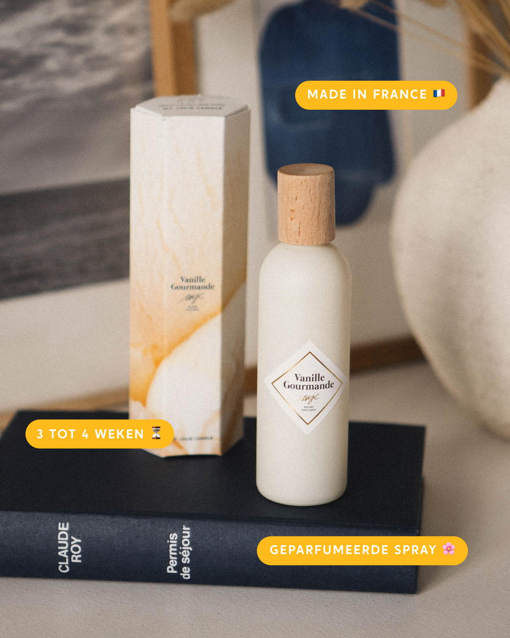 Met één enkele beweging verspreidt onze geparfumeerde spray Vanille Gourmande onmiddellijk een langdurige geur. Vanille op zijn troostendst. Zachte, verslavende noten, licht zoet maar altijd elegant. Een tijdloze favoriet, net zo lekker als een bolletje ijs als dessert. Geniet tot wel 4 weken lang van een heerlijke geur.