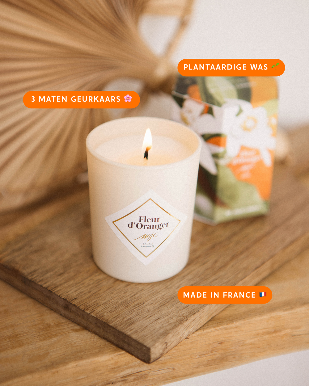 Geurkaarsen zijn ideaal om een gezellige sfeer te creëren. Ze zijn verkrijgbaar in drie maten, voor liefhebbers van kaarsen of om als attent geschenk te geven. Marrakech, wanneer de dag op haar einde loopt... De lucht is nog warm, doordrenkt met zachte en verleidelijke noten. Je bevindt je in de schaduw van oranjebomen, waar de geur van bloemen naar de zon en de Middellandse Zee ruikt.