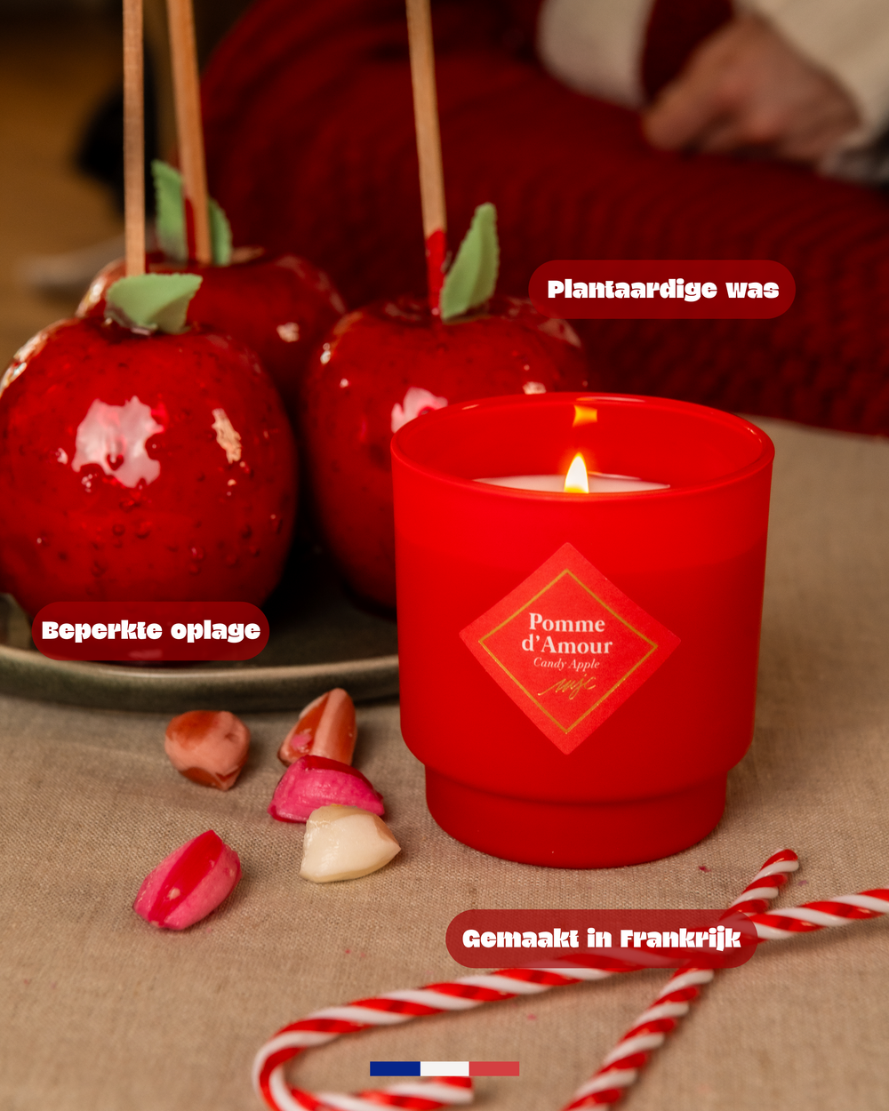 Herbeleef de zoete sfeer van kermissen met een kaars met geurnoten van gekonfijte appel en zoete kruiden. Een vrolijke en nostalgische geur, om zonder aarzelen van te genieten. Perfect om cadeau te geven of om jezelf een vleugje zoetigheid te gunnen.