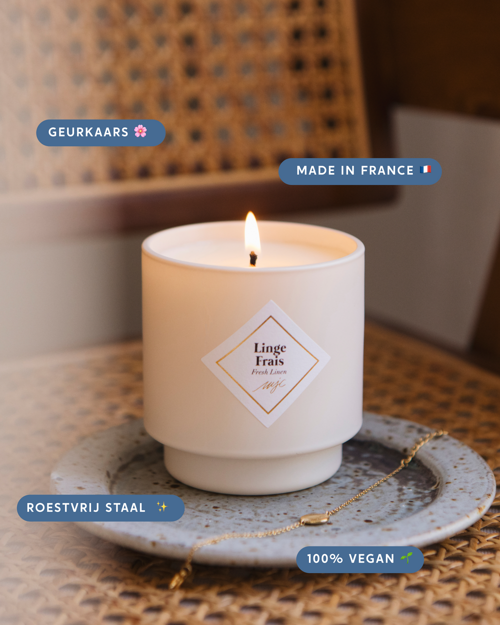 Ingredienten : Plantaardige was, lont van natuurlijke katoenvezels, armband van gerecycleerd roestvrij staal en verguld met fijn goud.