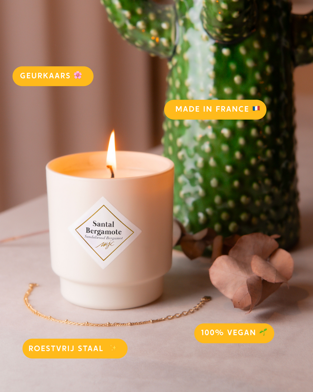 Ingredienten : Plantaardige was, lont van natuurlijke katoenvezels, armband van gerecycleerd roestvrij staal en verguld met fijn goud.